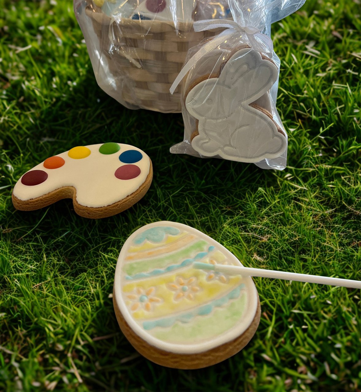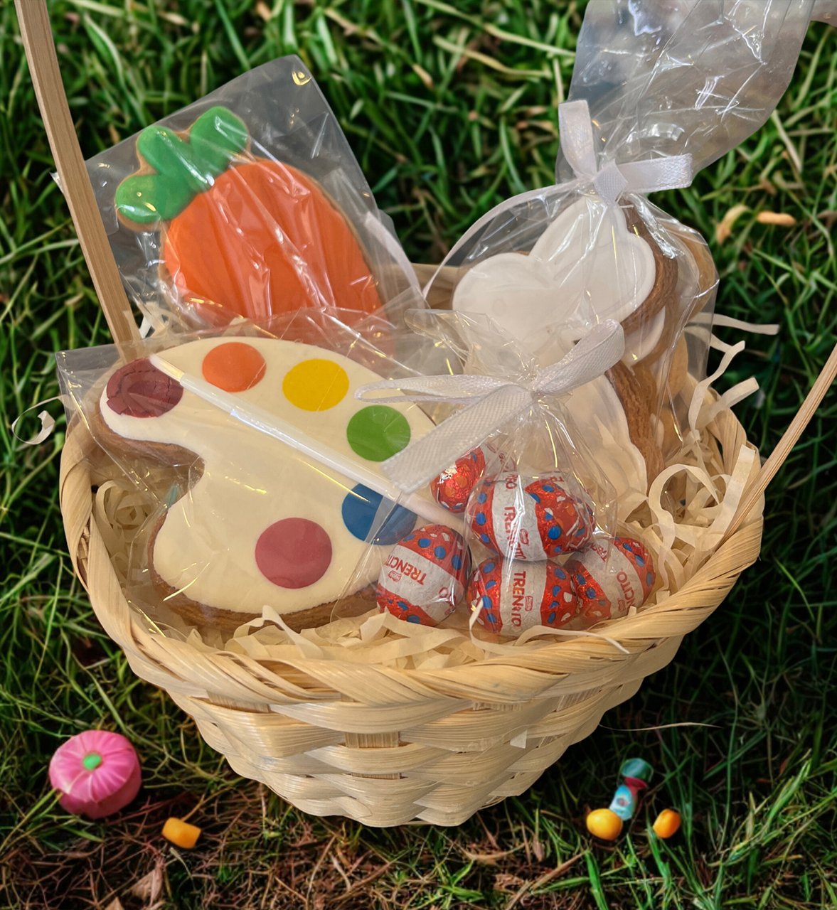 Además, el kit viene con una galleta decorada lista para disfrutar, una bolsita de huevitos de chocolate y todo presentado en una linda canasta, ideal para regalar o compartir en familia.