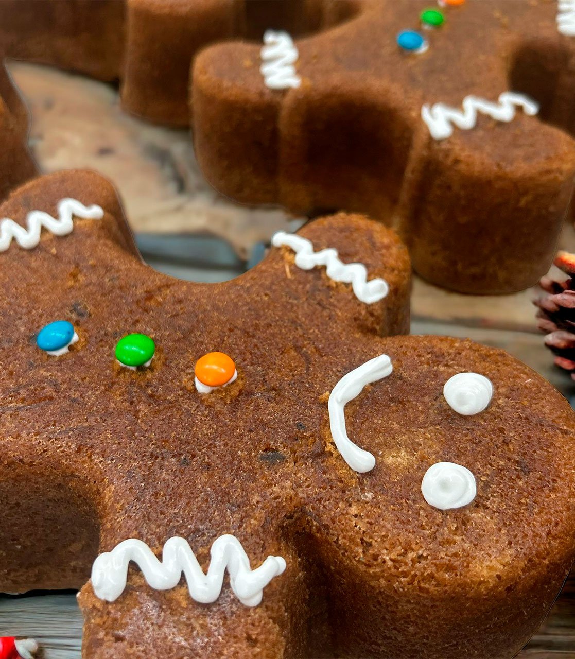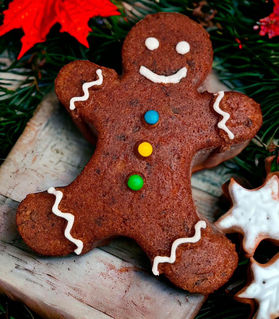 Nuestro Queque de Zanahoria Muñeco de Jengibre es una deliciosa propuesta navideña que combina la suavidad del tradicional queque de zanahoria con un tierno y festivo diseño de muñeco de jengibre. Elaborado de manera artesanal con ingredientes frescos, especias cálidas y un glaseado suave, es perfecto para acompañar celebraciones familiares, la mesa navideña o como un regalo dulce y especial en esta temporada. Una mezcla de sabor, aroma y encanto que captura la magia de la Navidad.